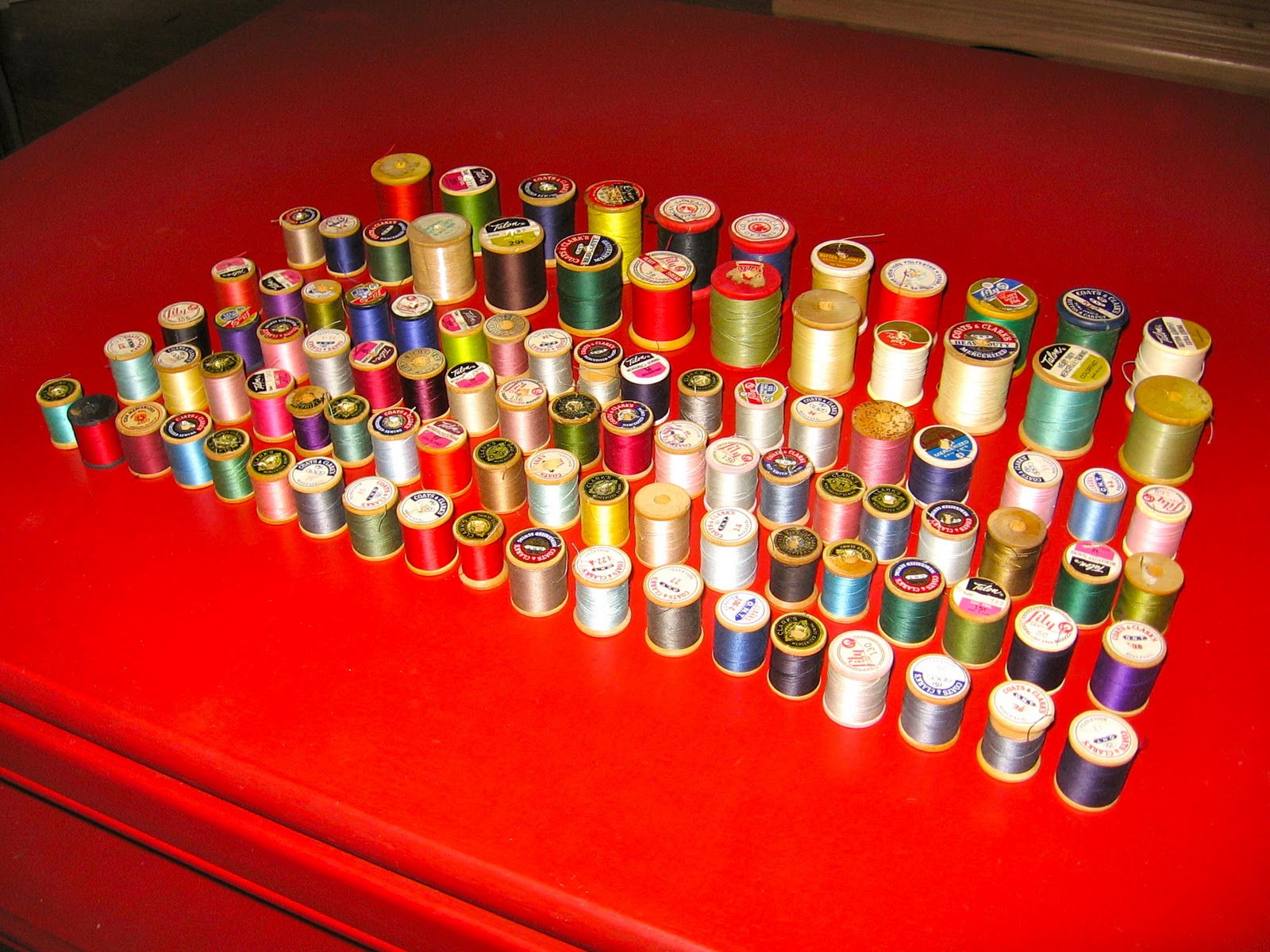 For $15 I snagged 100 spools of gorgeous vintage thread! That's only 15 cents a spool- vintage prices. A steal! If you know what a spool of thread costs now, then you know. A couple are still wrapped in plastic, never used at all. And lots of them still have a ton of thread left. I plan on using it too. I won't have to buy thread for a long time now hopefully. I should have most any color I could ever want.